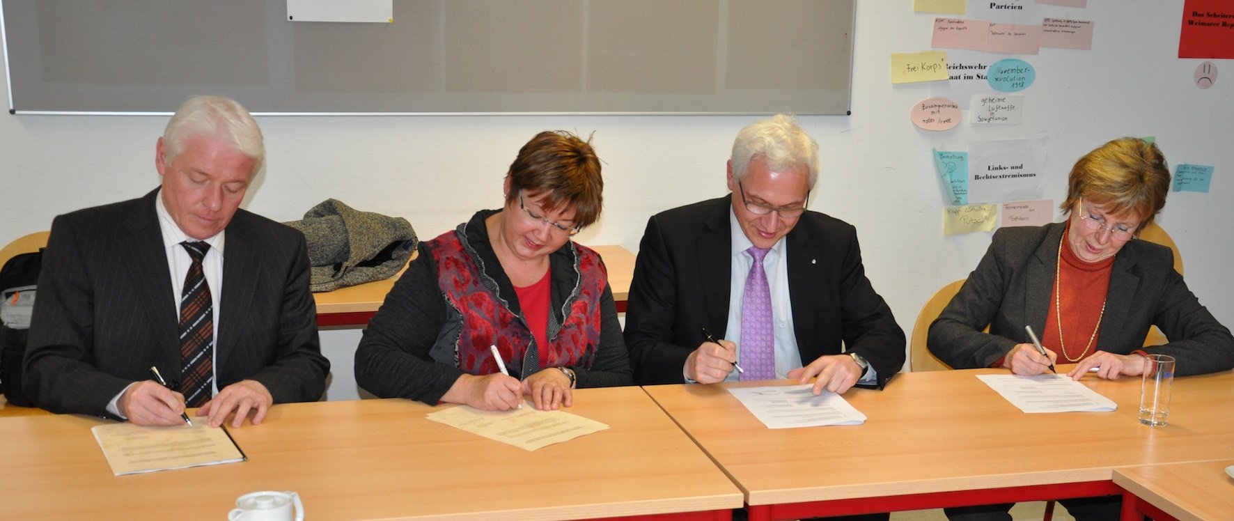Mosbach-Neckarelz. „Diese Partnerschaften bestehen nicht nur auf dem Papier, wir erfüllen sie auch mit Leben“, sagte Regine Schmock. Die Leiterin des Auguste-Pattberg-Gymnasiums freute sich sichtlich, die Bildungspartnerschaften mit der Dualen Hochschule Baden-Württemberg (DHBW) in Mosbach, mit der Sparkasse Neckartal-Odenwald und auch mit der Johannes-Diakonie Mosbach offiziell verlängern zu dürfen. Und das gleich für drei weitere Jahre. „Sie sehen, es ist uns ernst damit!“, ergänzte sie und setzte gemeinsam mit Johannes-Diakonie-Vorstand Jörg Huber, Sparkassen-Abteilungsdirektor Clemens Throm und Prof. Dr. Gabi Jeck-Schlottmann von der DHBW ihre Unterschrift unter die Verträge.